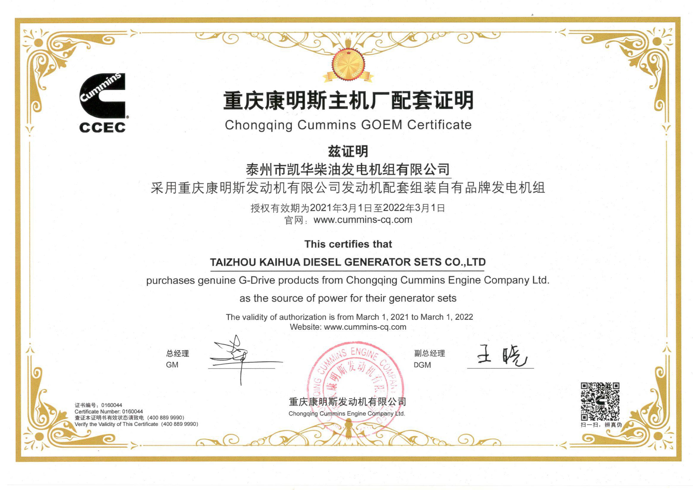泰州市凱華柴油發(fā)電機組有限公司創(chuàng)建于2003年,是一家集柴油發(fā)電機組燃氣發(fā)電機組的研發(fā)、生產、銷售為一體的高新技術民營企業(yè),公司座落于“漢唐古郡,淮海名區(qū)”,具有“鳳凰城”美稱的祥泰之州——江蘇省泰州市,地處中國經濟最發(fā)達的長三角經濟圈,水陸空立體交通,地理位置十分優(yōu)越。公司目前注冊資本金11800萬元人民幣,生產基地占地六十畝,現(xiàn)有各類高素質員工一百多名,專業(yè)技術人員達46人,其中高級技術人員16人,年銷售額近6億元。 公司主營產品:3~3000KW陸用柴油發(fā)電機組,15~600KW移動拖車電站,12~1000KW船用應急柴油發(fā)電機組,各種靜音型、中高壓、多機并聯(lián)、燃氣等特種機組以及進口系列柴油發(fā)電機組,可滿足不同客戶的一切電力需求,還可滿足用戶不同電壓、不同頻率的要求。凱華公司是康明斯品牌的授權代理商,專業(yè)生產供應康明斯柴油發(fā)電機組。